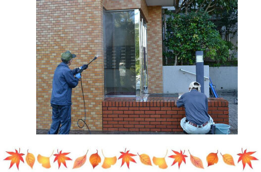 ・エントランス掲示でもお知らせのとおり、植え込みのレンガの洗浄に続き、エントランス外壁の高圧洗浄を行いました。