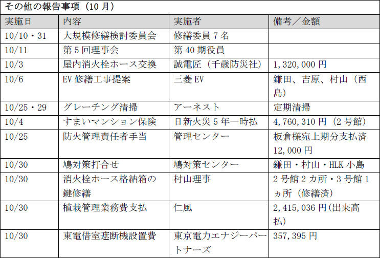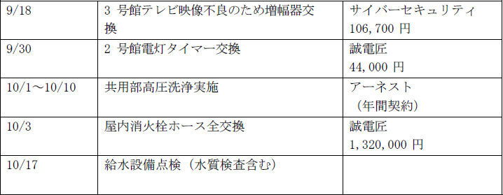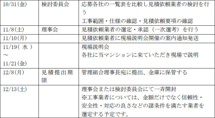 マンションの維持管理で一番大切な大規模修繕工事については検討委員会にて着々と進んでいます。 10 月 14 日には施工業者の公募を締め切りまして 10 社からの応募があ