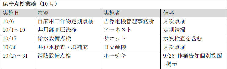 年に2回、消防法によって実施義務のある消防設備点検が10月27日~31日に予定されています。各戸にはお知らせが届いていると思いますので、ご協力よろしくお願いいたします。