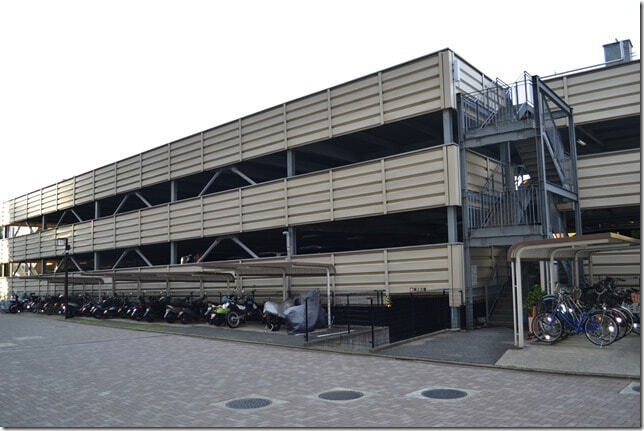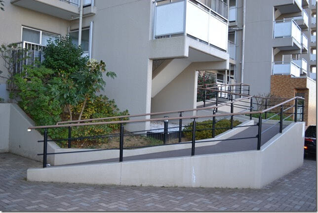 各号館のエントランスごとにスロープを設置し、非常階段には、手摺を設けています。